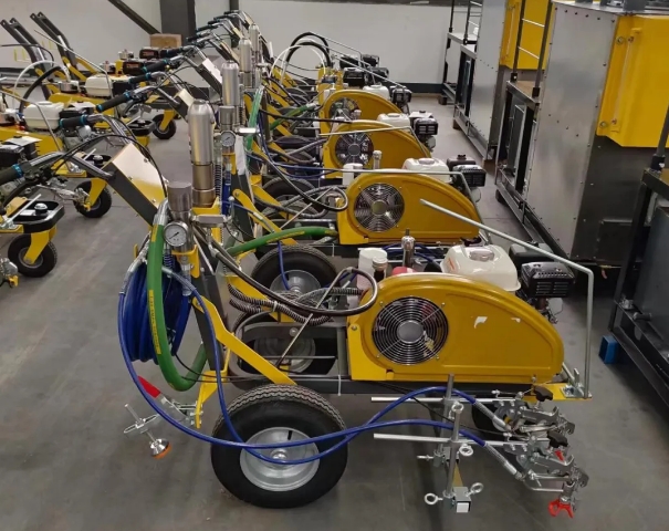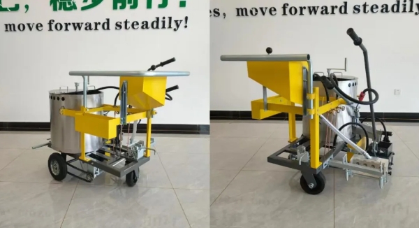 液压柱塞冷喷划线机是道路常温标线的专用设备。该设备采用本田汽油机,动力输出强劲稳定,适合在公路、广场、停车场、机场等各种环境下施工,支持单、双枪喷涂,压力稳定、喷涂流畅、线型美观、不易堵枪、长久耐用等特点。